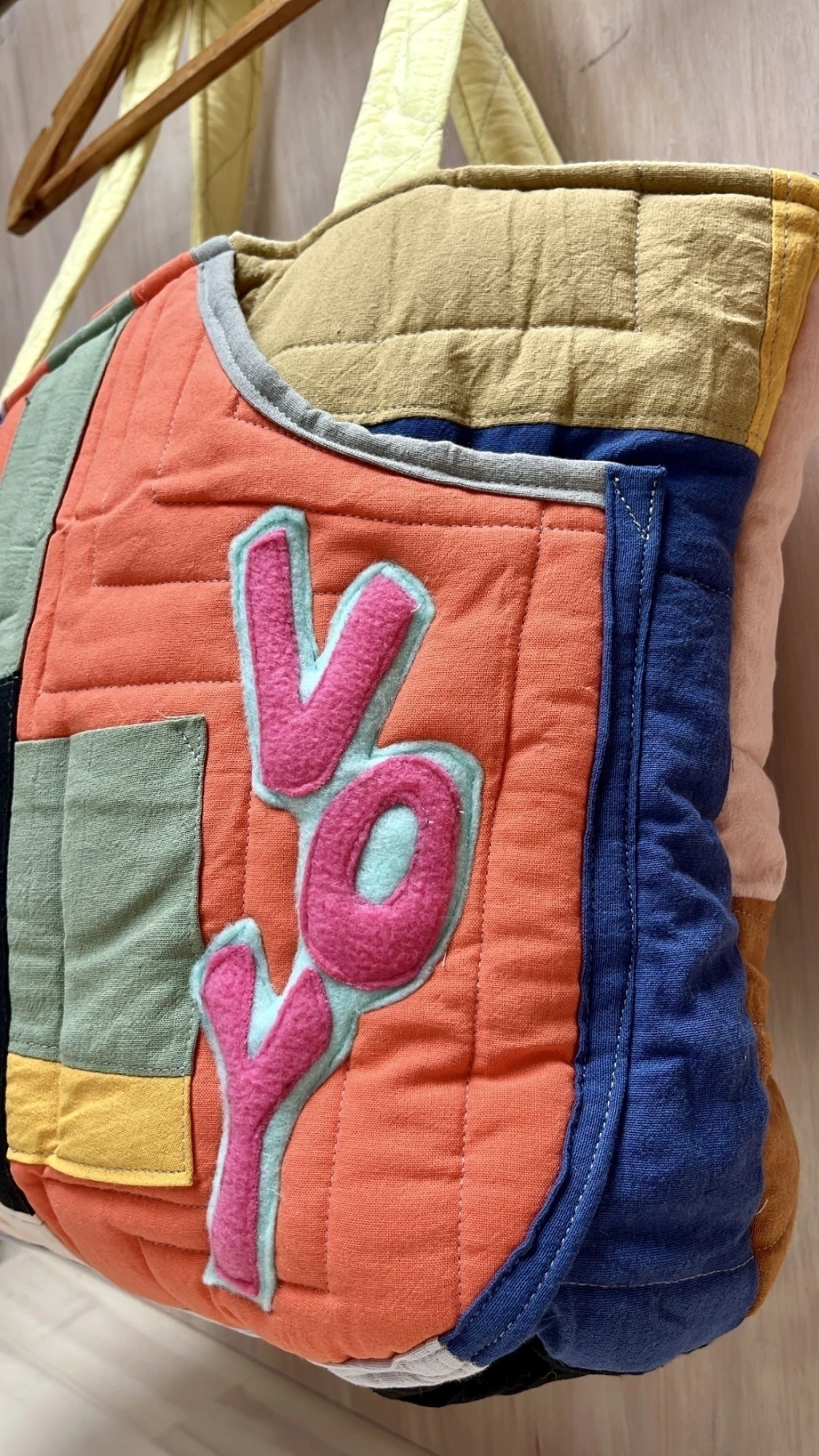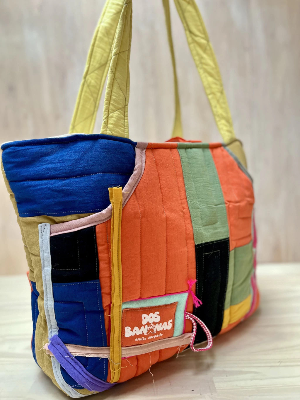Hecho en lienzo de algodón con combinaciones de distintas telas que lo hacen único e irrepetible.